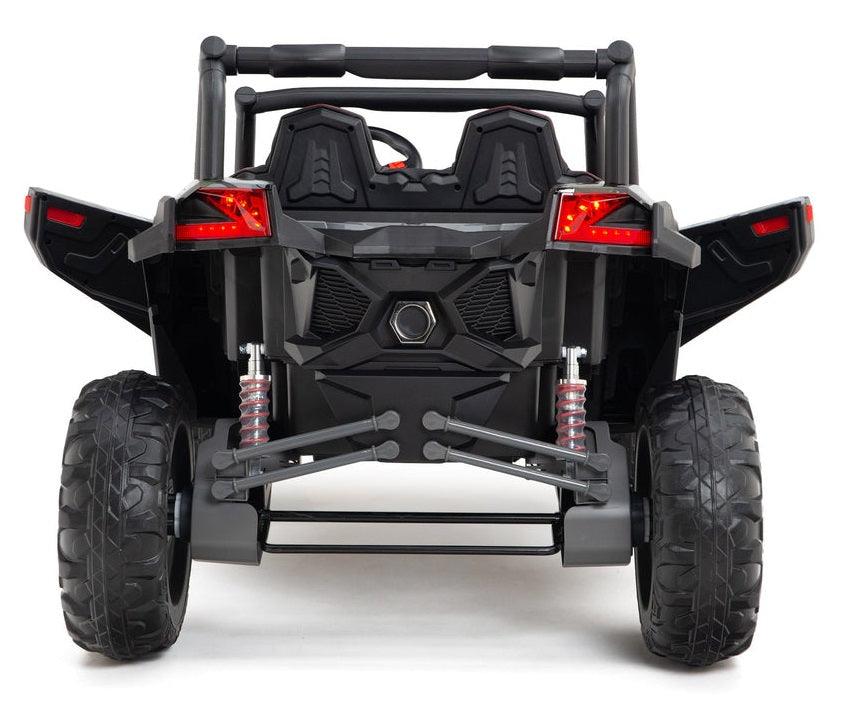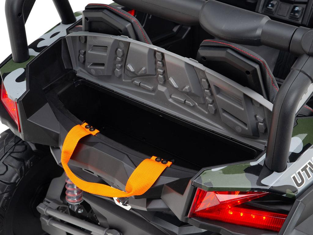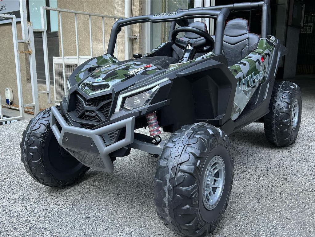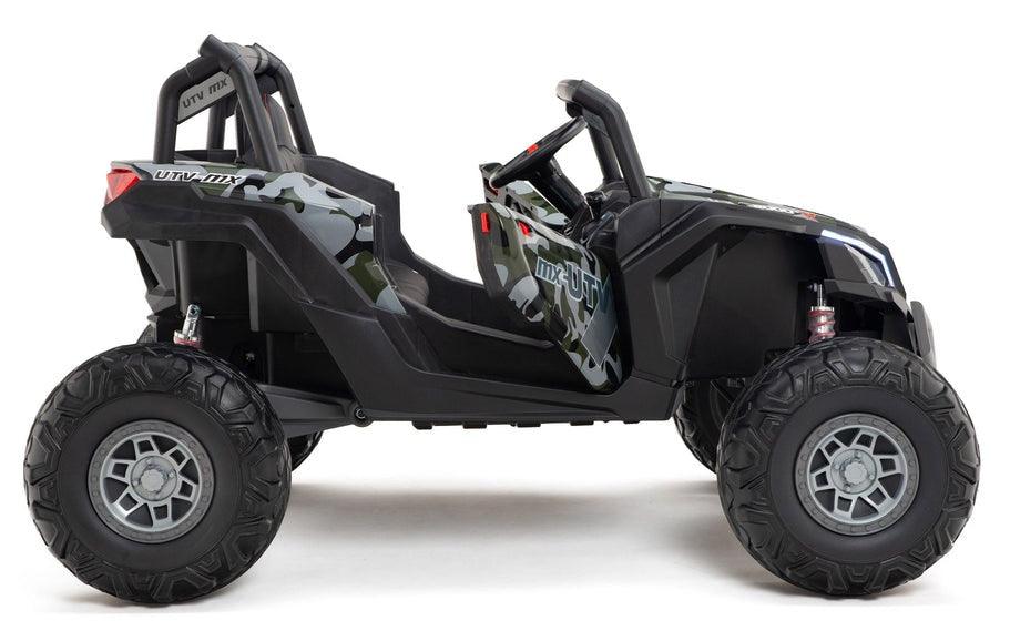 O Jeep UTV MX é um veículo para até 2 crianças, com cinto de segurança e dimensões de 142 cm (C) x 92 cm (A) x 86 cm (L); Peso: 34 kg. Equipado com motores de 4 x 45W, atinge até 11 km/h. Utiliza uma bateria de 24V, com carregamento de 8 a 12 horas e tempo de uso de 1 a 1,5 horas. Recomendado para crianças de 2 a 9 anos, suporta até 80 kg.