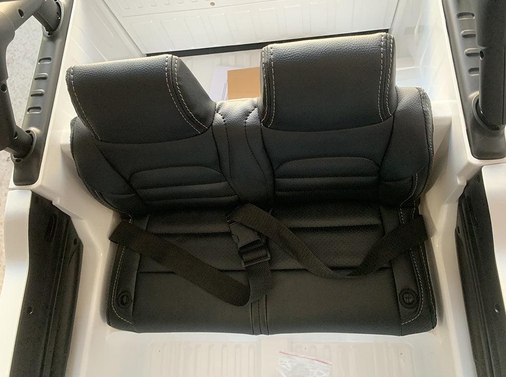 O assento duplo em couro sintético oferece conforto para duas crianças pequenas (de 3 a 4 anos) ou uma criança maior (até 8 anos). A capacidade de até 45 kg permite que crianças de diferentes idades aproveitem o passeio.